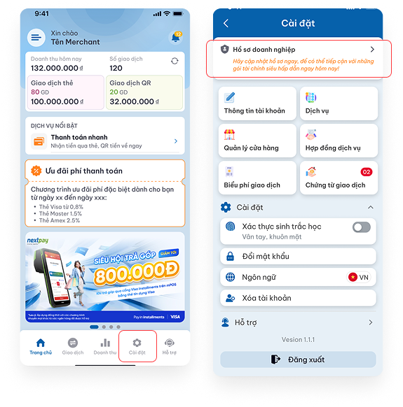 Tùy thuộc vào từng tài khoản Merchant, ứng dụng có thể yêu cầu cung cấp thêm các thông tin hoặc giấy tờ khác để xác thực.