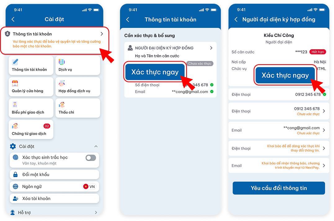- Cách 2: Chọn mục “Thông tin tài khoản” / Tìm đến mục “Người đại diện ký hợp đồng” / Nhấn nút “Xác thực ngay”