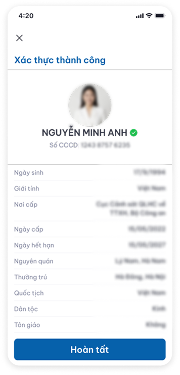 Sau khi kiểm tra dữ liệu trùng khớp, màn hình sẽ hiển thị thông báo "Xác thực thành công".